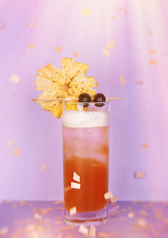 將所有原料搖勻,倒入加冰的高球杯。加滿蘇打水。用蘸有粉紅胡椒粒和細(xì)鹽的一片菠蘿裝飾。