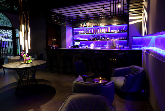 美食酒廊Opposite開在一幢修葺一新的兩層老洋房里,后面是一排高大上的豪華聯(lián)體公寓。它集各種截然不同的元素于一體:古典與現(xiàn)代、光明與黑暗、美食與酒飲。樓上的餐廳燈光閃耀,一樓的酒吧光線昏暗,籠罩著一種深沉的氣氛,這是在“向1930年代地下酒吧的低調(diào)風(fēng)格致敬”。
