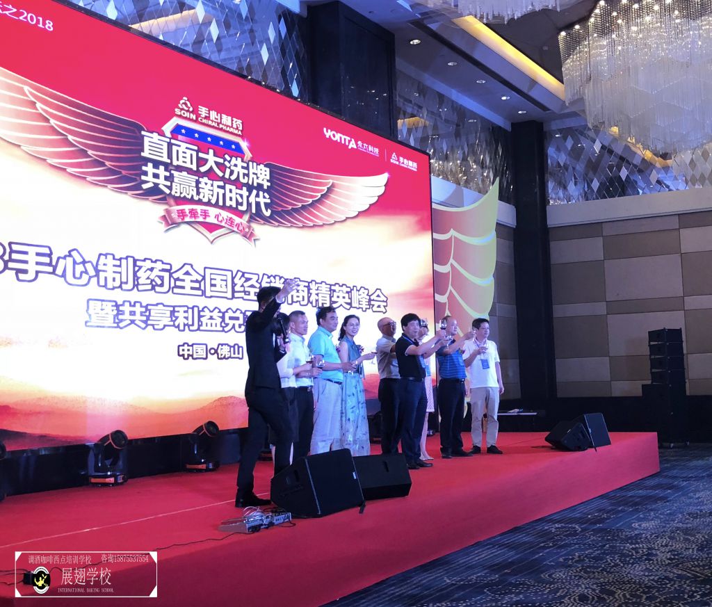 7月20日,2018手心制藥全國經銷商精英峰會暨共享利益兌現峰會在廣東佛山隆重舉行,佛山展翅咖啡調酒西點培訓學校花式調酒師張韋杰先生受邀為本次峰會進行花式調酒演出。