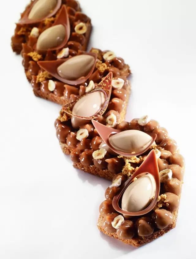 (Christophe在Valrhona學校) 當然,他的成功也離不開團隊的配合,和各方的支持。每一步走來,穩扎穩打的基本功才能讓天馬行空的創意得到充分發揮。盡管無法得知他的靈感來源,但Christophe的非凡創意總能讓人眼前一亮,看到這些作品,不得不贊嘆:“真是巧克力的藝術!” Christophe的作品各有千秋,以他擅長制作的法式撻為例,讓我們感受Christophe Renou帶來的法式甜點的魅力吧。
