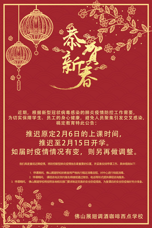 為避免春運返程引起大面積傳播、感染,各大技術院校紛紛推遲開學、開工。佛山展翅學院作為其中的一員,積極響應國家號召,切實保障學院每位學生與工作人員的身體安全,決定將開學時間延遲至2020年2月15日(年廿二)。