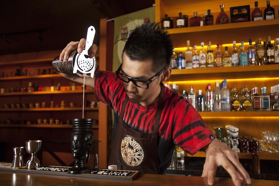 為什么做提基酒吧?就是因為上海還沒有。此外,朗姆酒在中國是一個尚未受到足夠重視的酒種。當然已經有酒吧在著手推廣朗姆,比如主打加勒比主題的Rhumerie Bounty,現(xiàn)在又有具有東南亞殖民地風格的Starling。這兩家都有不少朗姆酒收藏,不過都不是以提基風格為特色的酒吧。而我們這里是主推提基文化的酒吧。我們的靈感源于南太平洋島嶼——我們研究了許多照片后確定了內裝風格和色系,以及采用舊木門制成的桌子。Tiki China共有上下兩層,樓下是餐廳,大約200平米,由主廚David Leong負責, 樓上是酒吧,由何浩云負責。餐廳和酒吧相結合的益處是顯而易見的:不僅可以帶來更多客人,也可以通過更大的采購量控制成本。