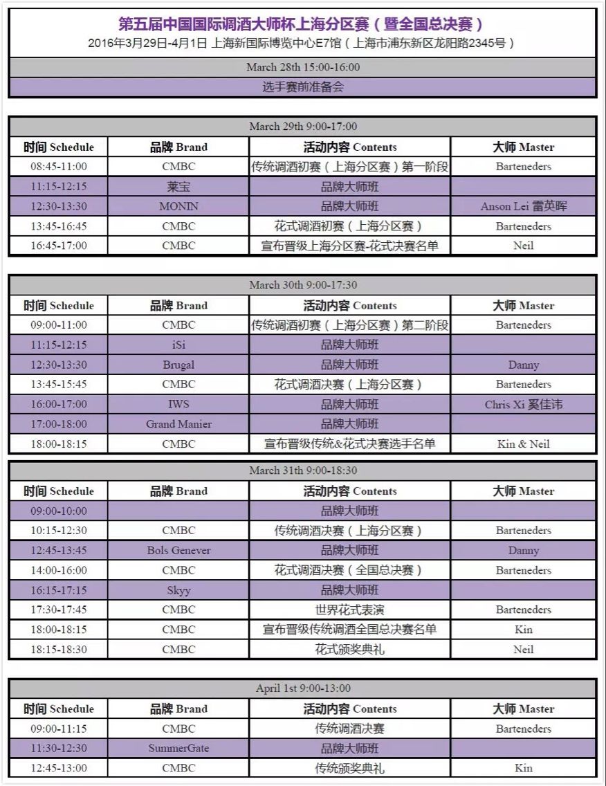 以上日程包含英式調(diào)酒、花式調(diào)酒、Master Class三個(gè)大環(huán)節(jié),具體時(shí)間以現(xiàn)場(chǎng)為準(zhǔn)