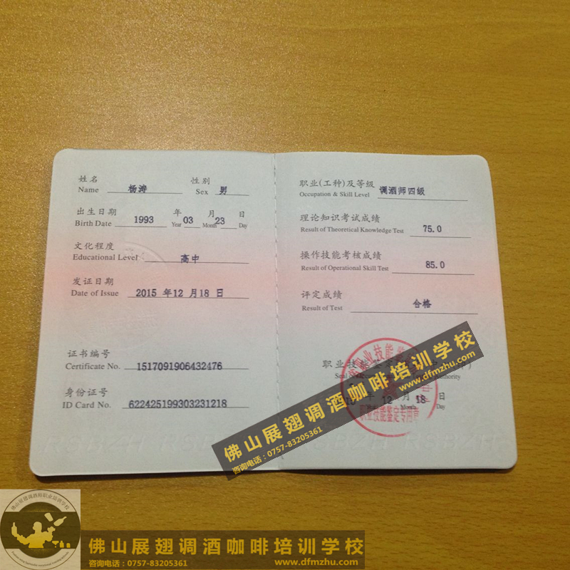 以下所有證書,都是佛山展翅調酒咖啡西點培訓學校畢業學生,考取的調酒師、咖啡師、西點師職業資格證書,為了防止盜圖,全部加了水印。