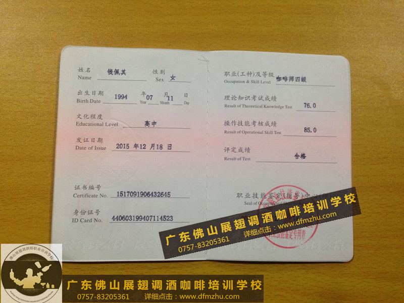 中英文版的職業資格證書出國通用。(調酒師、咖啡師、西點師職業資格證書)佛山展翅調酒咖啡西點培訓學校畢業學生,100%通過率,順利拿到中華人民共和國人力資源和社會保障部,頒發的調酒師、咖啡師、西點師職業資格證書部分樣版。
